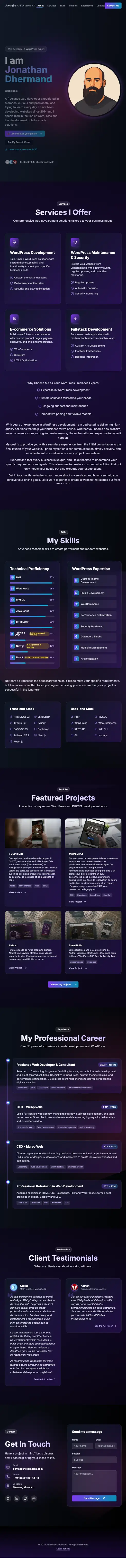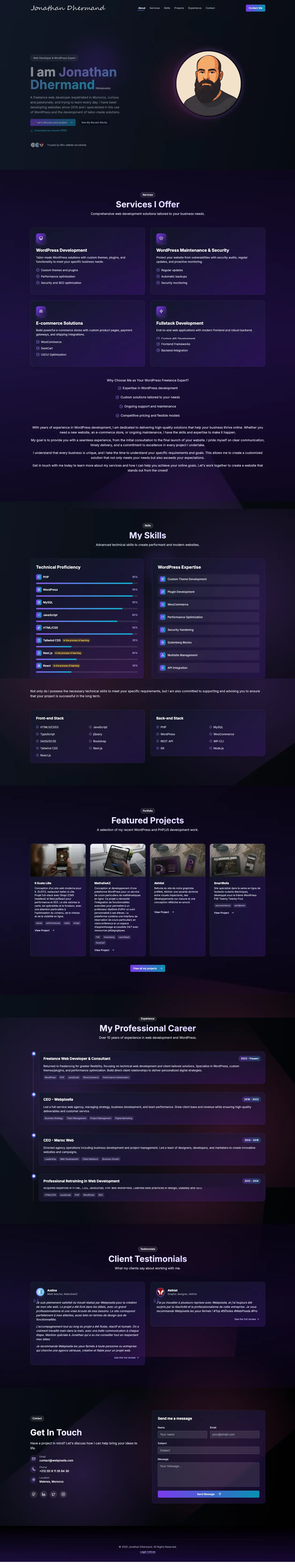 Personal website built with Next.js, React, and TypeScript, showcasing my profile as a freelance WordPress developer, along with my services, skills, and projects — featuring API integration and a fully responsive design.