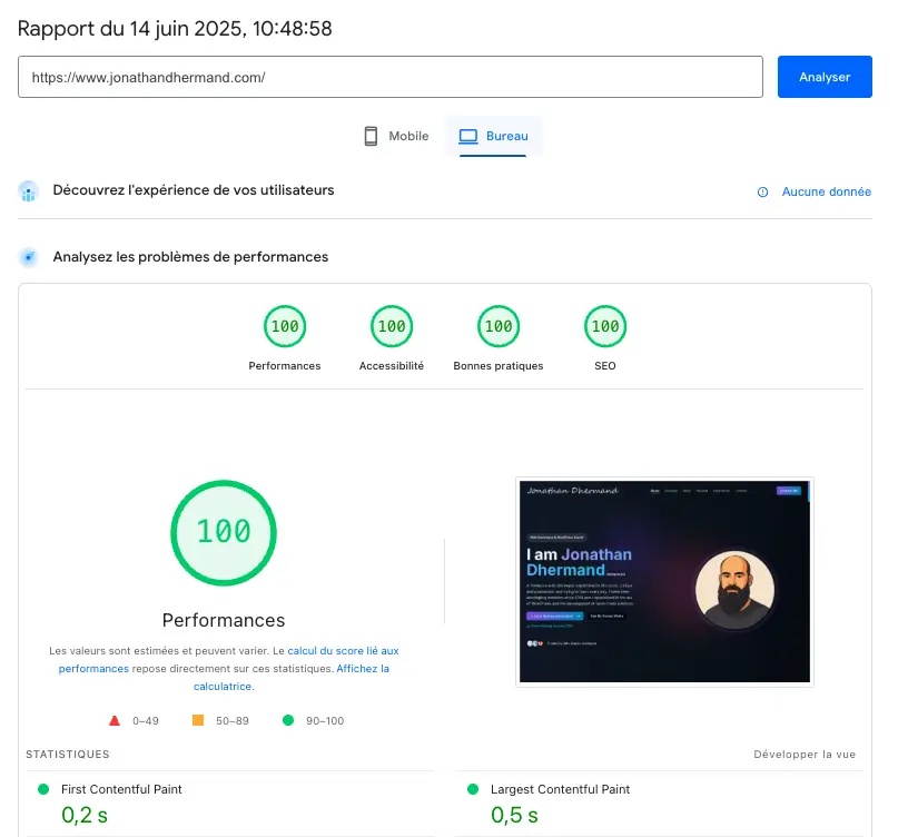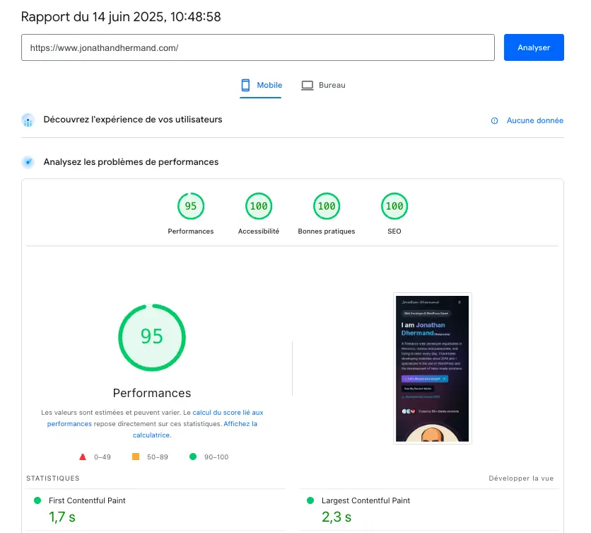 The goal of this project was to design a modern, high-performance professional showcase to present my skills as a freelance web developer, while delivering an optimal user experience and quick access to key information for potential visitors. This is a single-page website built with Next.js, React, and TypeScript, and hosted on Vercel, ensuring maximum performance and reliability.