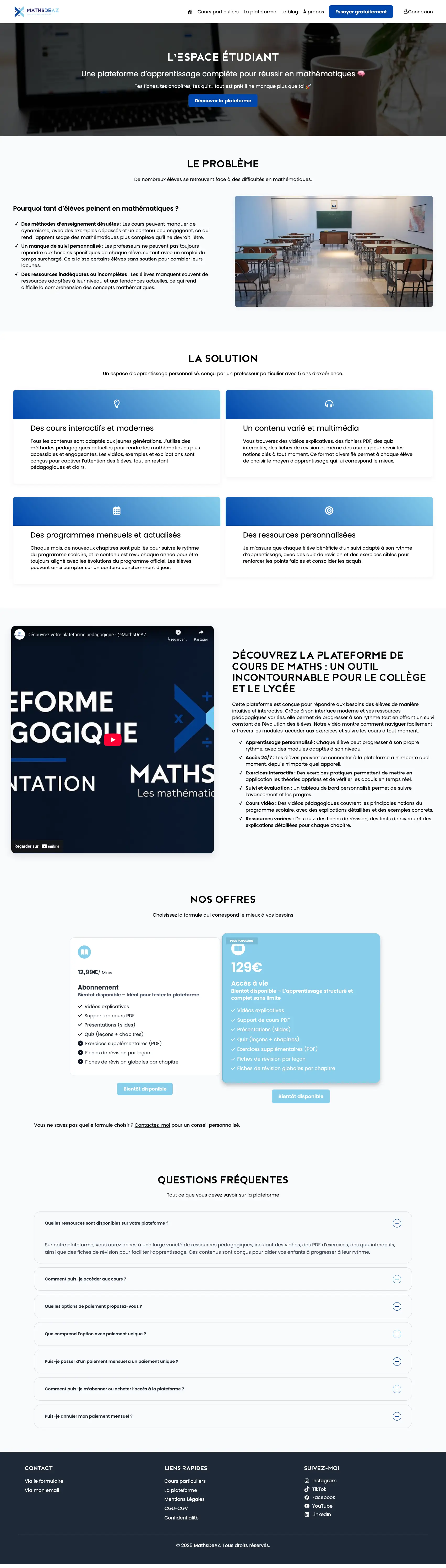 The client wanted to develop a modern and efficient educational platform dedicated to private mathematics lessons, aimed at students from 6th to 12th grade. The project had to integrate: